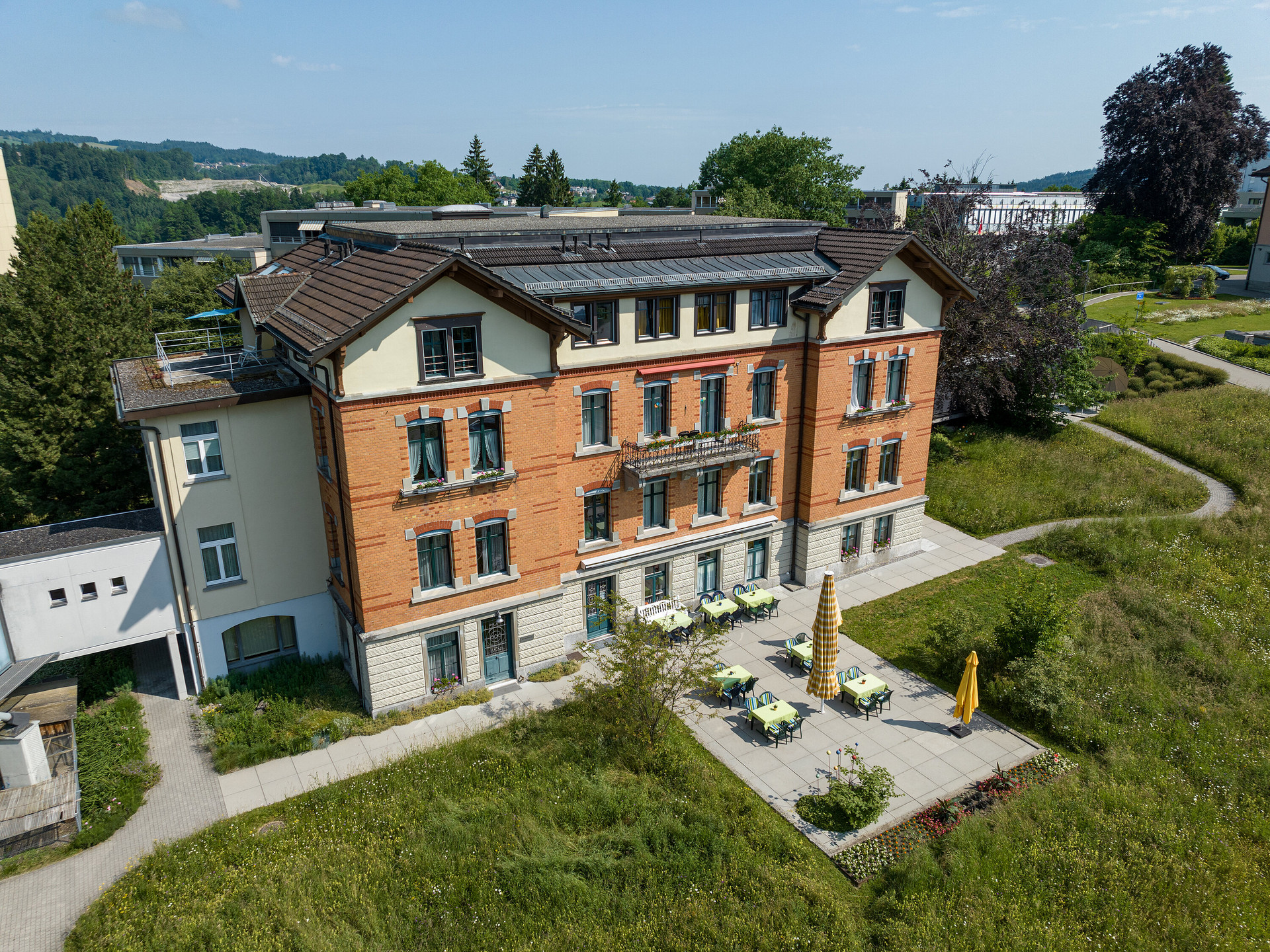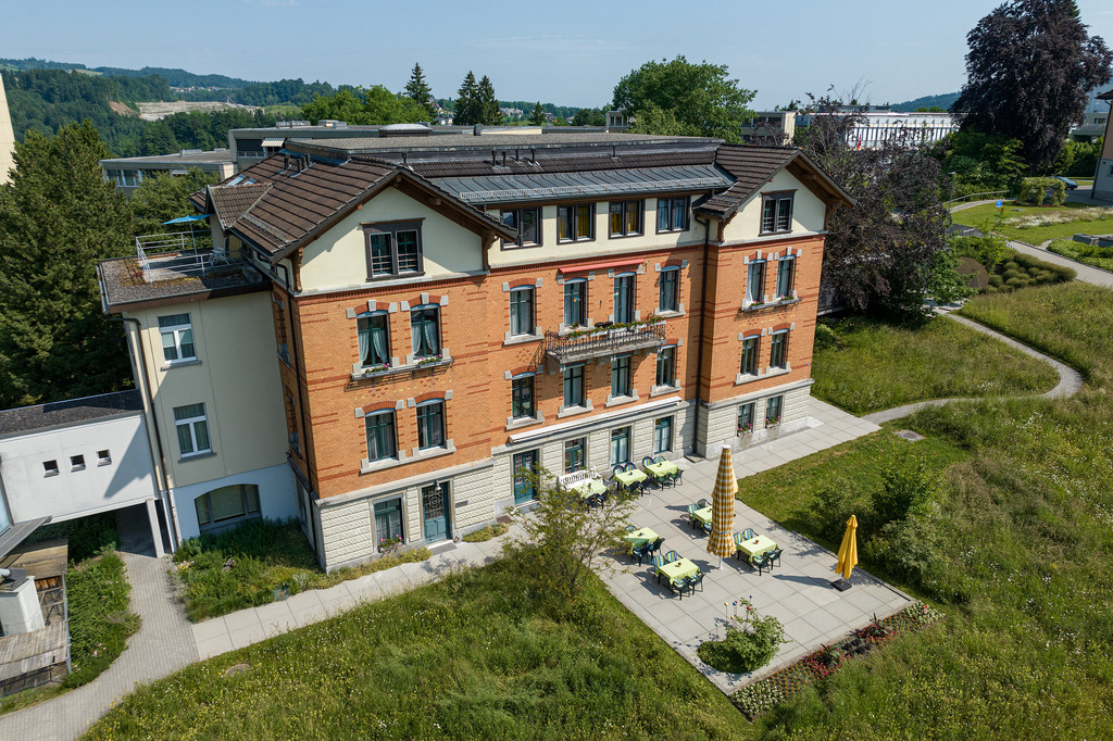 Der rötliche Ziegelbau hat den Charakter einer Fabrikantenvilla. Das kleinste unserer Häuser mit seinem familiären Charme verfügt über 15 Einzelzimmer und drei grosszügige Zweizimmer-Appartements für Paare. Ebenfalls hat die Verwaltung ihre Räumlichkeiten in diesem Haus.