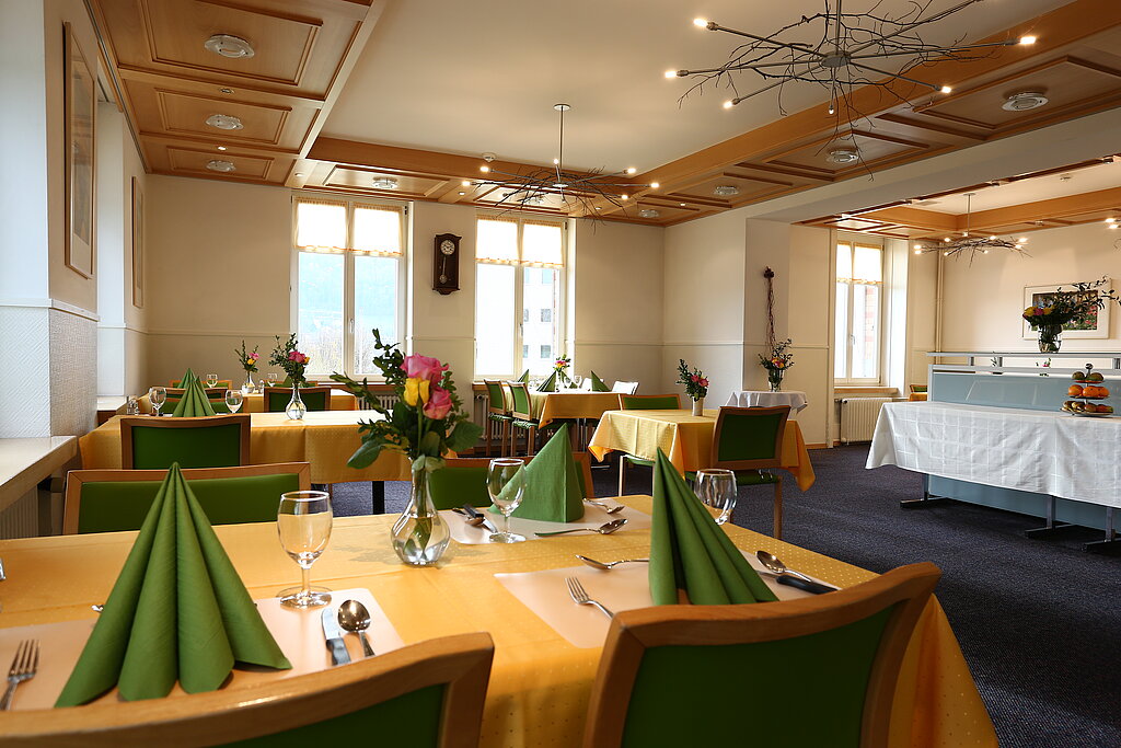 Im lichtdurchfluteten Speiseraum geniessen unsere Pensionärinnen und Pensionären die abwechslungsreichen Speisen.